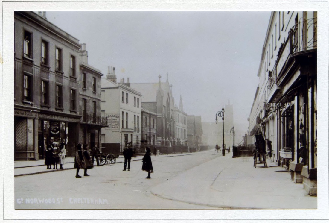 Great Norwood Street was laid out in around 1825 on land belonging to Henry Norwood Trye, the Lord of the Manor of Leckhampton. This had previously been part of the Westall open field, which was enclosed into smaller plots. The resulting field bordering the Suffolk Road was called the “”Grattons” or “Grottens” and through here ran a spur line of the horse drawn railway, bringing stone from the Leckhampton quarries to Grotten’s Wharf. Great Norwood Street was later laid out along the route of the railway. Number 45, built by 1825, by a stone mason named Richard Allen, may have been the first house erected. The street was named on the Merrett map of 1834, when it was still only partially developed.