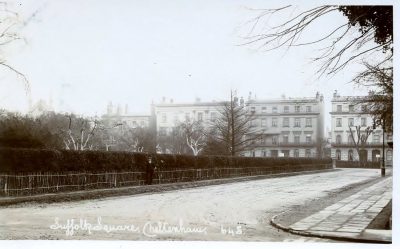 To the north, the Suffolks are bounded by Back Montpellier Terrace, which is part of an old field path joining Sandford Road to the Gordon Lamp junction and on to Alstone via Lad’s Lane. As it was a public highway Henry Thompson, the developer of the Montpellier estate, could not build over it and instead backed his southernmost terrace in Montpellier right up to its line.