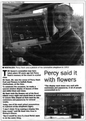 94 year old grandfather-of-two Percy Nash, of Hardy Road, Bishop’s Cleeve, contacted us in September and shared his own memories. Percy was the owner of Percy Nash Fruit and Flowers at number 24 Suffolk Road (now Le Champignon Sauvage).