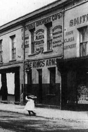 With its shiny brown tiles on the front wall, the King’s Arms looked much the same for the whole of the time it was here. The only thing that changed was the name of the publican painted on the upper part of the building.