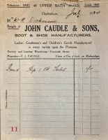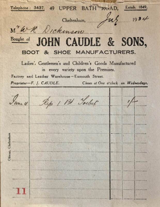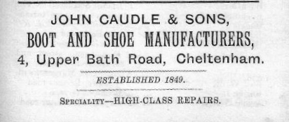 From the mid-nineteenth century, these premises were the home and business of bootmaker John Caudle. John was married to Mary and they had two sons, Frederick and Henry. Both sons were also shoemakers and the family business continued, after Johns death in 1901, until the late 1930’s. In a letter to the Echo in 1938 Miss Theodora Mills stated that Frederick had been an enthusiastic supporter of the women’s suffrage movement in Cheltenham.