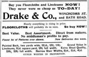 In 1906 Drake & Co, still remembered today in Cheltenham, leased this for their Bath Road drapery branch. In addition to selling a variety of clothing and soft furnishings over the years, in June 1911 Drakes advertised an extensive range of decorations for the coronation of King George V. They remained here at 3 (later 47) Bath Road until their lease expired in February 1914.