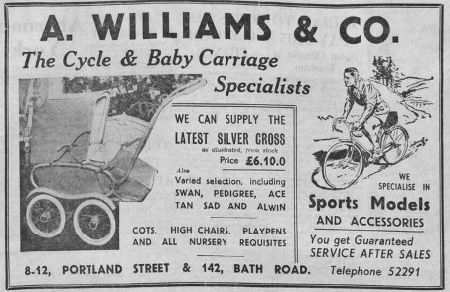 A complete change occurred in 1936, when the premises became the Bath Road branch of the cycle dealer A Williams and Co, whose main shop was in Portland Street. The manager here was Mr Frederick Ernest Meadows.