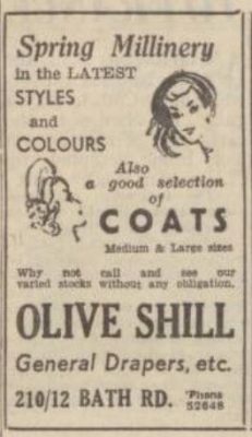 A very popular shop in Bath Road, it was a sad day when Olive Shill closed in 1957, having witnessed the changing fashions from the Edwardian period, through two world wars and beyond.