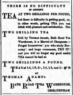 In 1860 this property housed Thomas Adams’s Bath Road Tea Warehouse and he was fined in that year for not maintaining proper weights and measures. Mr Adams, who was born in Bedfordshire, sold a variety of groceries in addition to tea and coffee, advertising “astonishing bargains” for cash payments to both wholesale and retail customers.