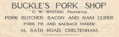 Mr Whiting and his son Vic made their own pork pies, which were baked for them at Cripps Bakery (see 161 Bath Road). The pork butcher sold only pork products and every part of the pig was used. The Whitings were known for their excellent pork sausages. After Charles died Vic carried on the family business, still trading in his father’s name, finally relocating from Bath Road to the town centre in the early 1950s.