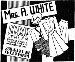 There were then many occupants of number 238, including The Radio and TV Service Company; Mrs A. White, a wardrobe dealer in the war years; Sew, a sewing machine repair business; and in the late 1950s Cheltenham Dress Agency.