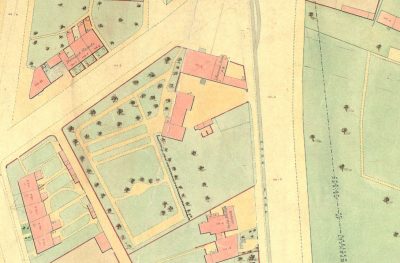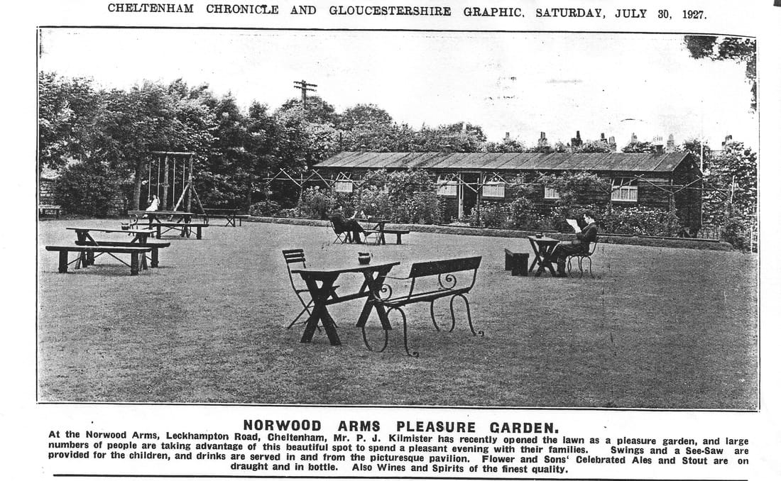 In 1810 the new horse-drawn Gloucester & Cheltenham Tramroad was connected to an existing system serving the quarries on Leckhampton Hill, before the modern street pattern was established. It passed alongside the site of the future Norwood Arms, which was built in 1821 by Samuel Kearsey of Minchinhampton, on part of a field called Breach Hill that he bought from Henry Norwood Trye. The Inn was the only house in the vicinity at the time and a beautiful stream from Leckhampton Hill flowed past it (this has since been culverted). The Inn is named in honour of the Norwoods, Lords of the Manor of Leckhampton from 1486 to 1797. At the time of building, the surrounding area would have been a mixture of fields, hedgerows, farm tracks, tram lines, busy stone yards and the odd lime kiln.