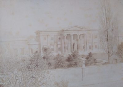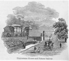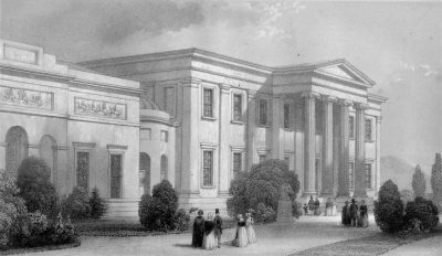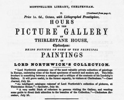 Within a few years Northwick’s art collection had outgrown even this additional space, so he bought Thirlestaine House as his private art gallery. This also proved to be inadequate to his needs, so he added two wings in the 1840s, making the entire length of the building about 300 feet. The illustration above, from Davies “Stranger’s Guide to Cheltenham” (1843), shows only the northern wing extension had been built at that time.