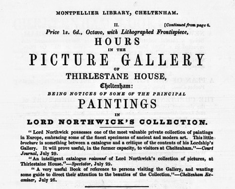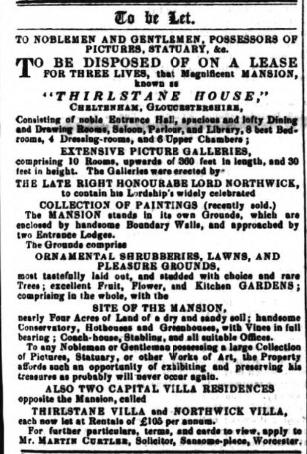 Thirlestaine House was advertised to be let in 1861 and was rented for £400 per year in 1863 to Sir Thomas Phillipps, a Governor of the British Museum, to house his enormous collection of books and manuscripts, said to exceed 100,000. Although most of the Northwick art collection had been liquidated at the 1859 auction, Sir Thomas Phillipps did acquire a group of the paintings to remain in Thirlestaine House. The Harvard Library website has an album of photographs of the picture galleries in 1866, showing primarily oil paintings, but also a frieze, genealogical rolls, furniture, ceramics, and some bookshelves containing books. See https://iiif.lib.harvard.edu/manifests/view/drs:459915774$21i