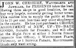 The interest in bicycles ceased quite soon and, after leaving this shop, Mr Cheshire went on to run his branch in North Street until at least 1920.