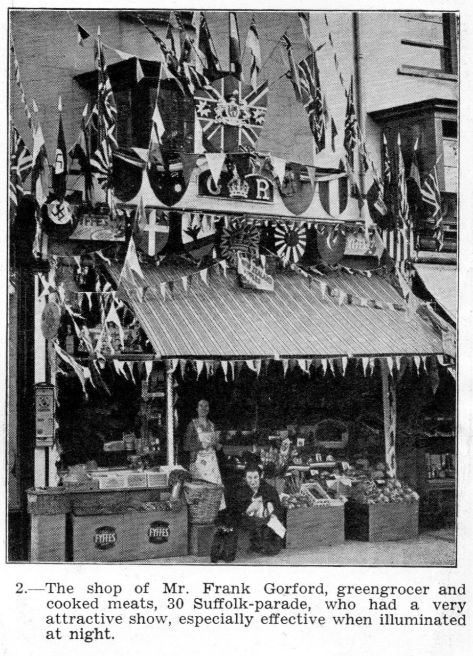 Then came another complete change when Mr Frank Gorford opened a greengrocery and cooked meat shop at these premises in the mid 1930s. In 1937, to celebrate the coronation of George VI, Mr Gorford decorated the shop front with bunting and flags of the world. Interestingly this included the flags of Japan and Nazi Germany – something that would have been unthinkable less than 3 years later.