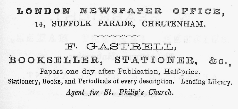 He was followed here in about 1858 by Mr T. Gastrell who sold books, newspapers and stationery. Successive generations of the Gastrells traded at this address until after 1910 but their name continued at another branch of the business at Montpellier Exchange, until at least 1970. ​