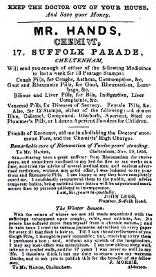 Mr Bradshaw was followed a few years later by another chemist, Mr W. Hands but he also had left by the late 1850s. (Click on the image to the left to read about the range of pills he supplied.)