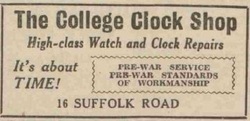 By 1891 the trade had changed again to George Jones, Boot & Shoe maker, and we know he was still here in 1919. Later, in 1934, Mrs B. Avery is listed here as a Wardrobe Dealer. However in 1938 Mrs B. Dodwell is also listed as a Wardrobe Dealer and perhaps she had remarried? Then by 1950 another Watch and Clock repairer was here, when the property was The College Clock Shop, advertising pre-war standards of service and workmanship. It is interesting to reflect that the economic impact of the Second World War lasted well into the 1950s.