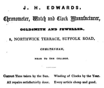 This was after standard time began to be used in Britain, by the railways, in 1847, so they must have made an adjustment for longitude. It is unlikely that any jeweller in Cheltenham could do this today! Edwards was still here in the 1881 census.