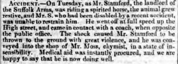 On Saturday 13th October 1836 the then landlord, Mr Stamford, had a dramatic riding accident and seems fortunate to have survived, as the accompanying newspaper report shows.