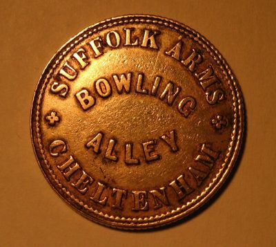 Public house tokens were widely used in Britain from about 1845 to 1914. They were typically made of brass and had a variety of uses. The one shown below was probably used at the Suffolk Arms to buy beer as a way of recompensing the landlord for the use of the skittles alley.