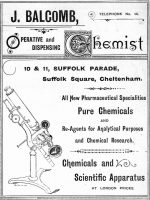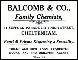 In addition to the chemist shop, Mr Balcomb manufactured chemicals and sold scientific apparatus. In 1894 he was able to include the telephone number 14 in his advertisements, at a time when very few traders were connected to the National Telephone Company exchange in Regent Street. By 1914 he owned the neighbouring property at number 9 Suffolk Parade.