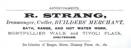 Robert Strang was born in Devon in 1842 and came to Cheltenham at the age of 19, when he studied at the School of Art. He worked for the builder’s merchant J. Cormell for a few years, before joining his brother in Chicago, USA, where he witnessed the great fire of 1871, which killed around 300 people. As a result of his wife’s poor health, Robert returned to Cheltenham. In 1879 he opened an ironmonger’s shop in Montpellier Walk and in 1890 he acquired Cormell’s business here in Tivoli Place. The Montpellier shop later became R. Strang & Son but here in Tivoli the original business name was retained. Robert Strang died in 1914, aged 73.