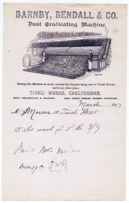 Immediately next door to what is today the Dry Cleaners, was a narrow building which marked the end of the continuous line of shops until about 1880. For a time in the 1850s and 1860s it was the retail shop for Cormell and Sons, Builders, No. 8 Tivoli Place. In 1874 it was acquired by Barnby Bendall from where they ran their retail outlet for wallpaper – French hangings at 4d for 12 yards – and upholstery fabrics. Carpet beating was later arranged at their Tivoli Works just around the corner in Lypiatt Street where ‘…..the latest invented and best machines will clean your carpets at 1d per square yard.’