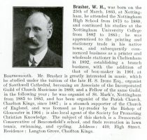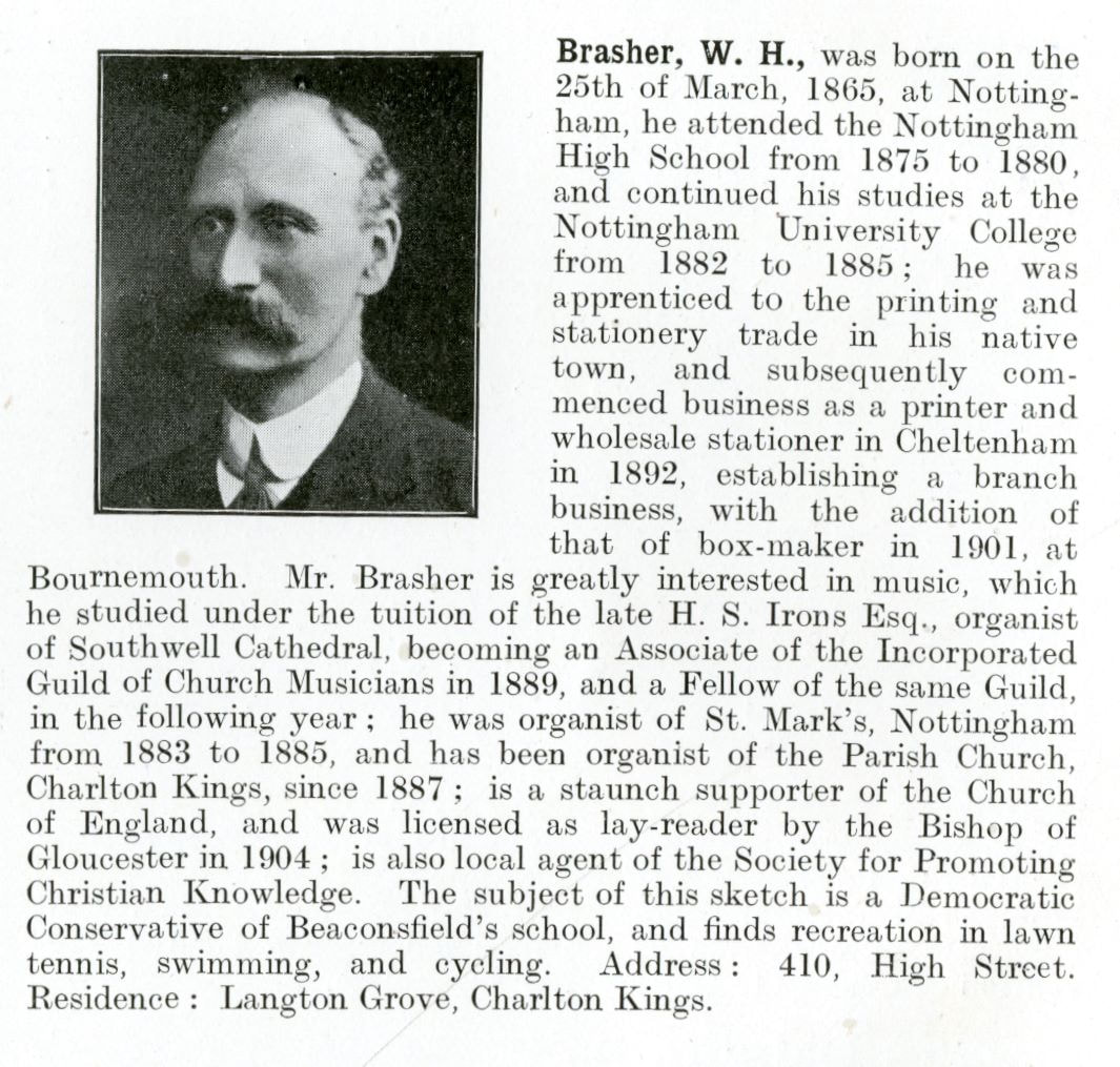 William Brasher was listed in ‘Who’s Who in Cheltenham’ in 1910 and you can read his entry here by clicking on the image to the right.