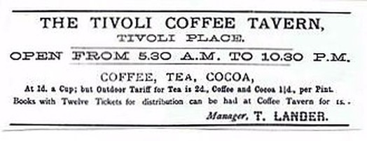 The Tavern was fitted up in ‘an attractive and artistic style, with drink and food provided at the usual moderate tariff.’ Meals were provided from 5.30 am until 10.30 pm – rice pudding and cakes, chops and steak, with afternoon tea at 3d per head. The Tavern also served as the depot for the Provident Coal and Clothing Company. One could suggest that this was Tivoli’s first Social Centre! The Vicar of St Stephen’s at the time wrote that such institutions would halt the progress of intemperance by inducing breadwinners of the neighbourhood to prefer it to the Public House – a sure way of ingratiating himself with the landlords of the five hostelries in the very small and heavily populated area about which he was talking!