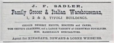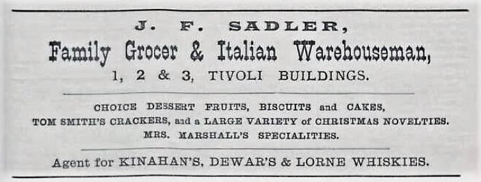 In his various advertisements it seems clear that Mr Sadler offered a wide range of food, household products and wines and spirits over the years he was here. By the 1920s this shop was known as the “Tivoli Supply Stores”. Mr Sadler died in 1925 and the grocery business was continued by Wilding & Co.