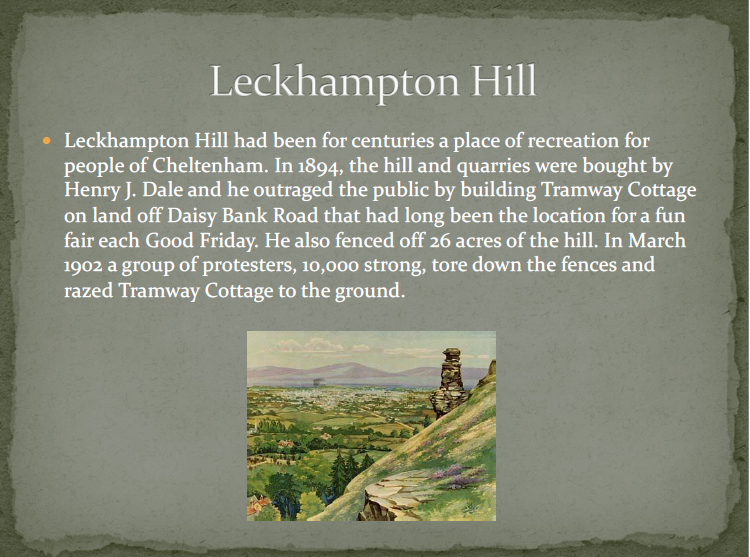 In the 1790s Charles Brandon Trye, the Lord of the Manor, introduced a horse-drawn tramway system to his stone quarries on Leckhampton Hill. In 1810 he extended the tramway to form a spur of the Gloucester and Cheltenham Tramroad, which ran from a wharf near the present Tesco superstore in Gloucester Road, all the way to Gloucester Docks. This greatly facilitated the transport of the stone both to Cheltenham and also wider afield via the River Severn.